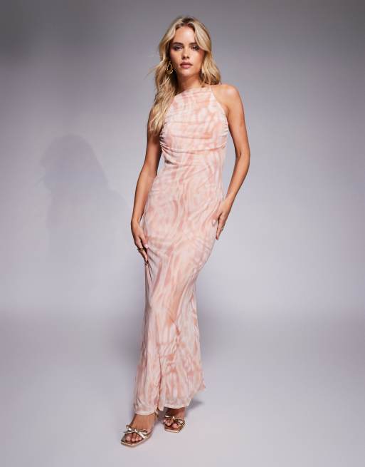 ASOS DESIGN Petite – Netzstoff-Maxikleid in Blush mit Neckholder, Blumenprint und Rückenträger mit Besatz