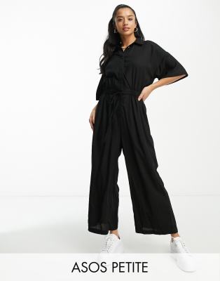 ASOS DESIGN Petite – Oversize-Jumpsuit in Schwarz mit Oberteil in Hemd-Optik und Bindegürtel