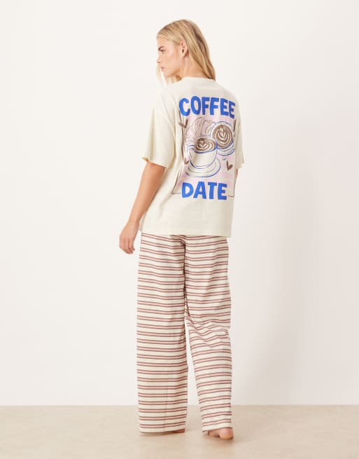 ASOS DESIGN Petite – Pyjama, bestehend aus Oversize-T-Shirt mit „Coffee Date“-Grafikprint und Hose mit weitem Bein in Braun