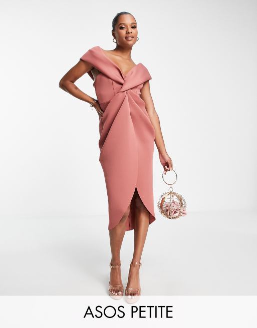 ASOS DESIGN Petite – Schulterfreies Midikleid in Rosé mit verdrehtem Design vorne