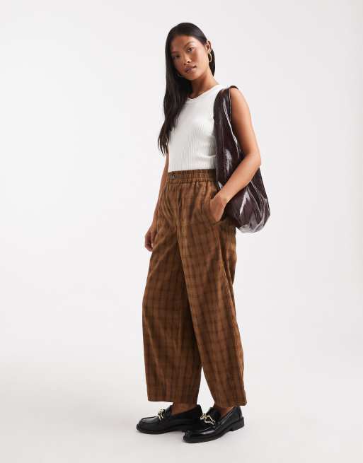 ASOS DESIGN Petite – Strukturierte, karierte Barrel-Leg-Hose in Senfgelb mit elastischem Bund und Nahtdetail