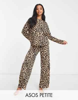 ASOS DESIGN Petite – Viskose-Schlafanzug aus langärmligem Oberteil und weit geschnittener Hose in Braun mit Leopardenmuster