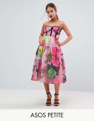 ASOS PETITE – Trägerloses, geblümtes Midi-Ballkleid aus verstärktem Netzstoff