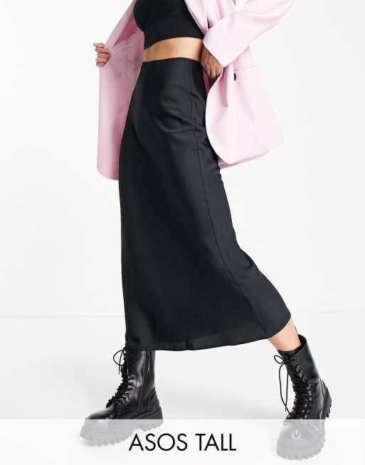 ASOS DESIGN Tall – Asymmetrischer Satin-Midirock zum Schlüpfen in Schwarz