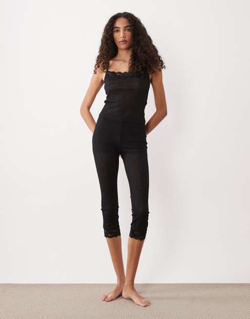 ASOS DESIGN Tall – Halbtransparente Capri-Pyjamahose in Schwarz mit Spitzenbesatz