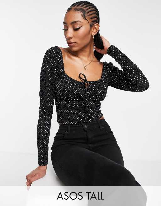 ASOS DESIGN Tall – Langärmliges Oberteil mit Punktemuster, eckigem Ausschnitt und Bindedetail