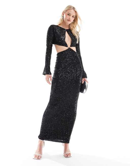 ASOS DESIGN Tall – Langärmliges Pailletten-Maxikleid in Schwarz mit Wickeldetail und Schlüssellochausschnitt