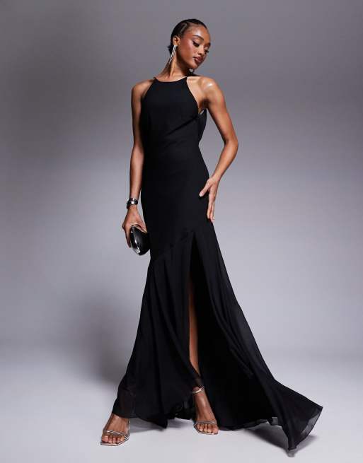 ASOS DESIGN Tall – Maxikleid in Schwarz mit Ringerrücken, tiefem Wasserfallausschnitt hinten und nach hinten abfallendem Rüschensaum