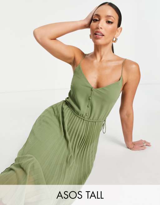 ASOS DESIGN Tall – Plissiertes Midi-Trägerkleid in Khaki mit Kordelzug in der Taille und Knopfleiste vorne