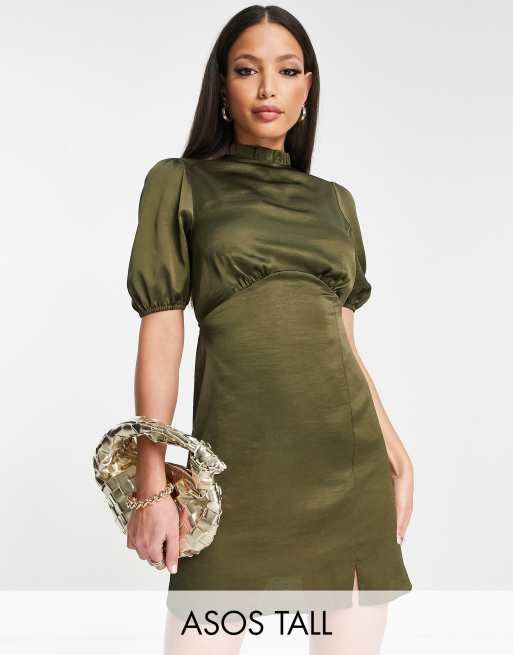 ASOS DESIGN Tall – Satin-Minikleid mit hohem Halsausschnitt und Puffärmeln in Khaki