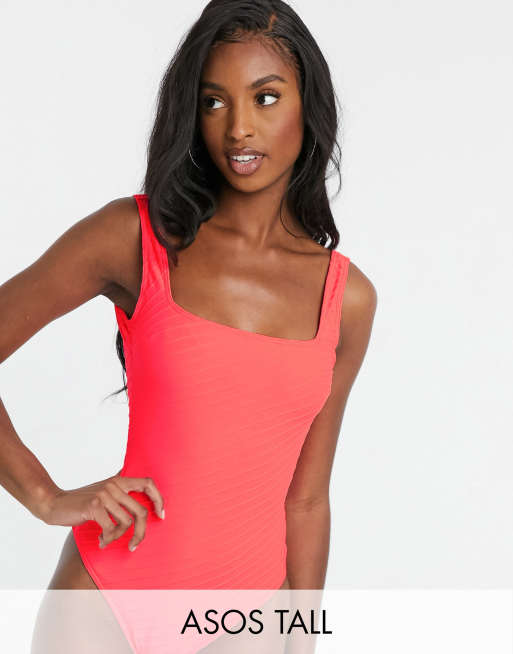 ASOS DESIGN Tall – Stark gerippter Badeanzug mit eckigem Ausschnitt in verblasstem, fluoreszierendem Rot