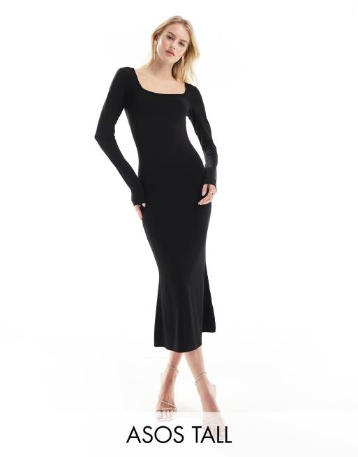 ASOS DESIGN Tall – Weiches, langärmliges Midikleid in Schwarz mit eckigem Ausschnitt