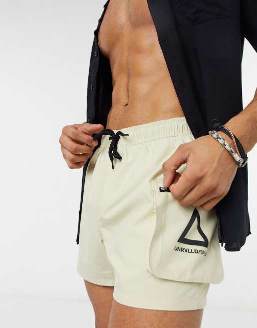 ASOS – Unrvlld Spply – Kurze Cargo-Badeshorts in Stein mit Logo
