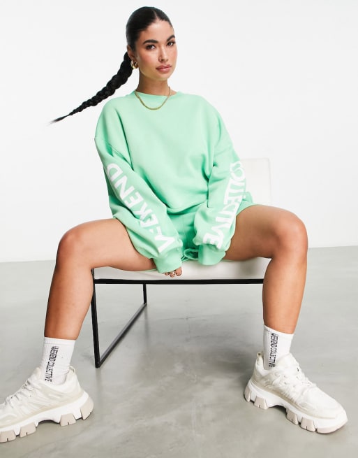 ASOS – Weekend Collective – Kurzes Sweatshirt und Shorts in Apfelgrün mit Grafik