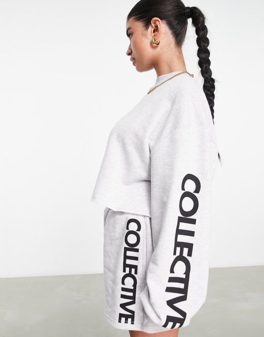 ASOS – Weekend Collective – Kurzes Sweatshirt und Shorts in Grau meliert mit Grafik