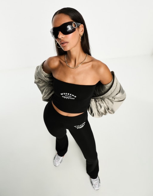ASOS Weekend Collective – Schlaghose mit breitem Bund und Oberteil in Schwarz mit Logo