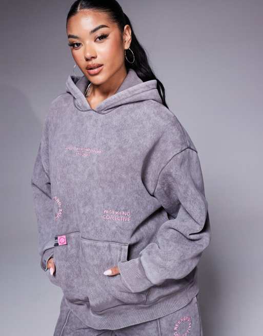 Weekend Collective – Oversize-Kapuzenpullover in verwaschenem Grau mit rosa Logos
