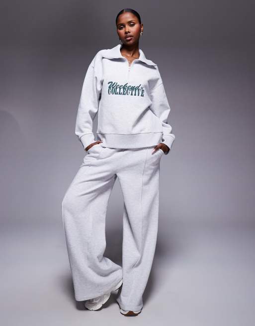 Weekend Collective – Sweatshirt in grau meliert mit kurzem Reißverschluss und Schriftzug in verschiedenen Schriftarten