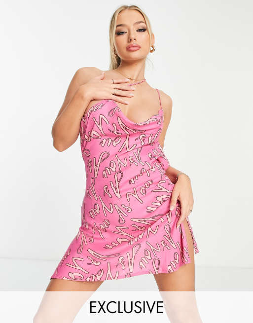 ASYOU – Asymmetrisches Camisole-Kleid in Rosa mit Monogramm-Muster und Wasserfallkragen