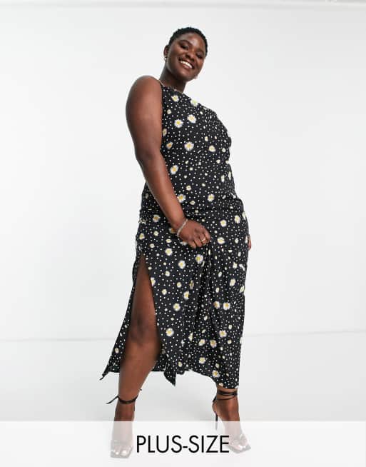 AX Paris Plus – Midikleid aus Satin mit Wasserfallausschnitt und Gänseblümchen-Print