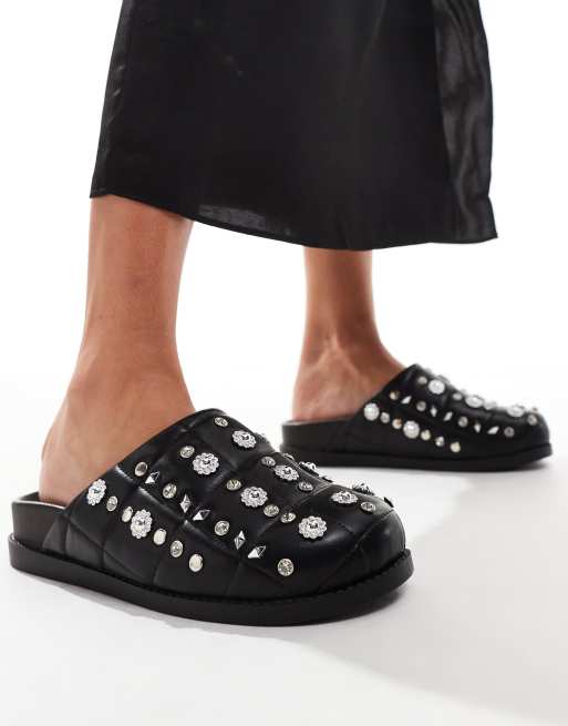Azalea Wang – Anslie – Mules in Schwarz mit Webstruktur und Nietenbesatz