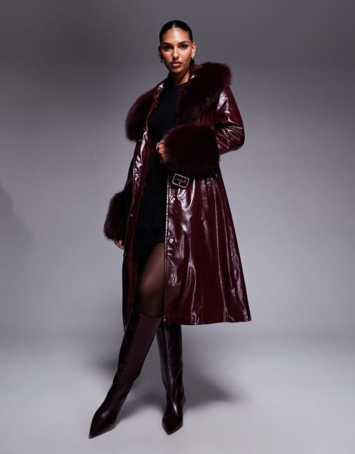 Azalea Wang – Asher – Trenchcoat aus Kunstleder in Burgunderrot und Kunstpelzbesatz