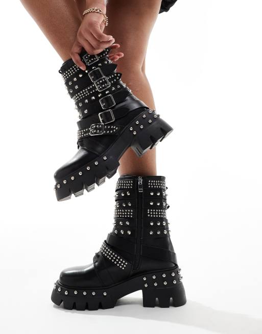 Azalea Wang – Winola – Ankle-Boots in Silber mit dicker Sohle, Nietenbesatz und Schnallendetails