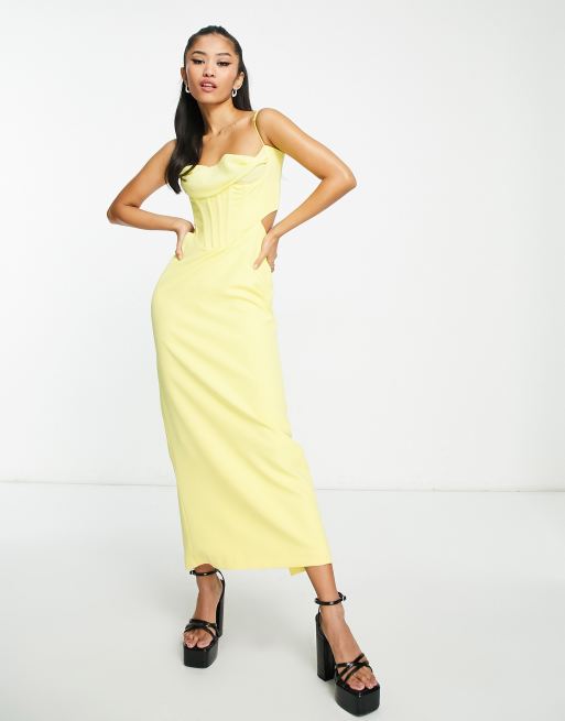 Bardot – Gewebtes, wadenlanges Kleid in Zitronengelb mit Drapierung und Korsettdetail