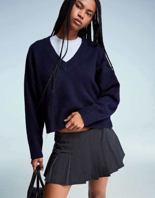 Bershka – Cropped Pullover in Jeansblau mit V-Ausschnitt