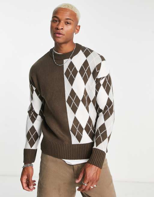Bershka – Exklusiver Oversize-Strickpullover in Braun mit Rautenmuster