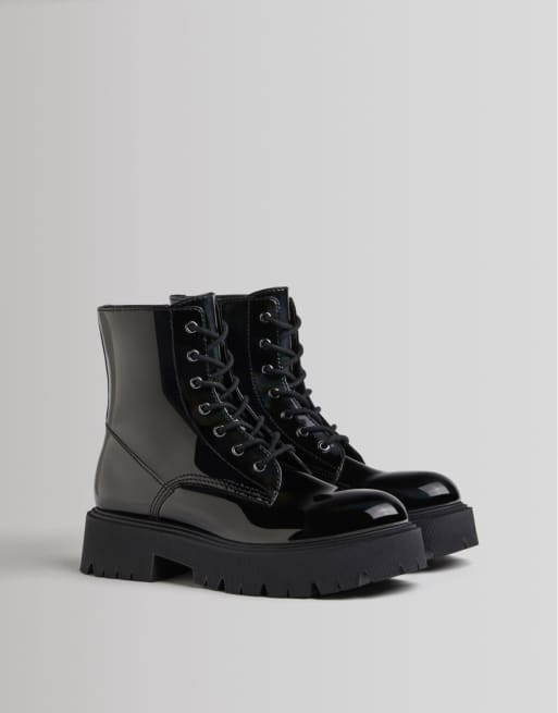 Bershka – Flache Ankle-Boots zum Schnüren in schwarzer Lackoptik mit dicker Sohle