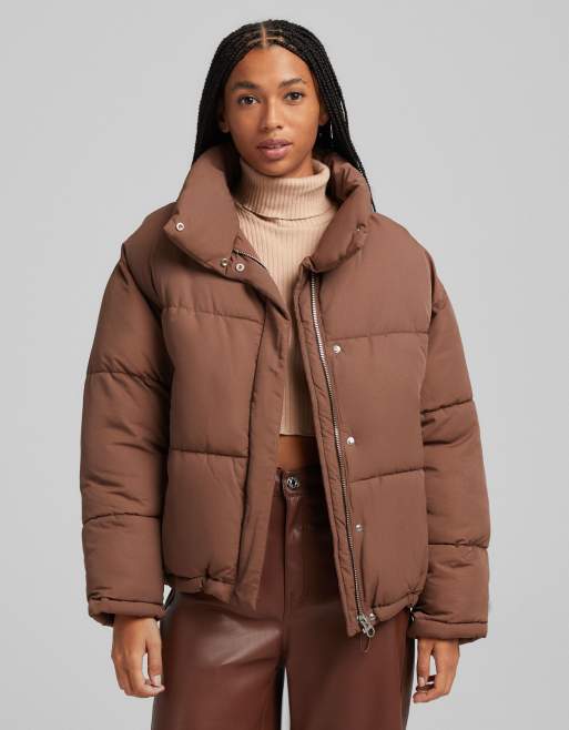 Bershka – Gefütterte Oversize-Jacke in Braun
