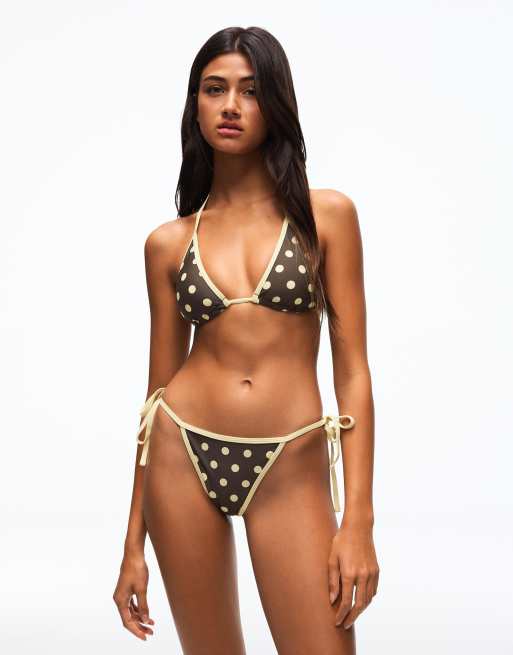 Bershka – Gepunktete Tanga-Bikinihose in Braun