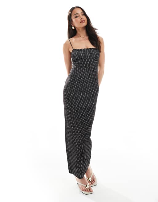 Bershka – Gerade geschnittenes Maxikleid in Schwarz mit Punktmuster