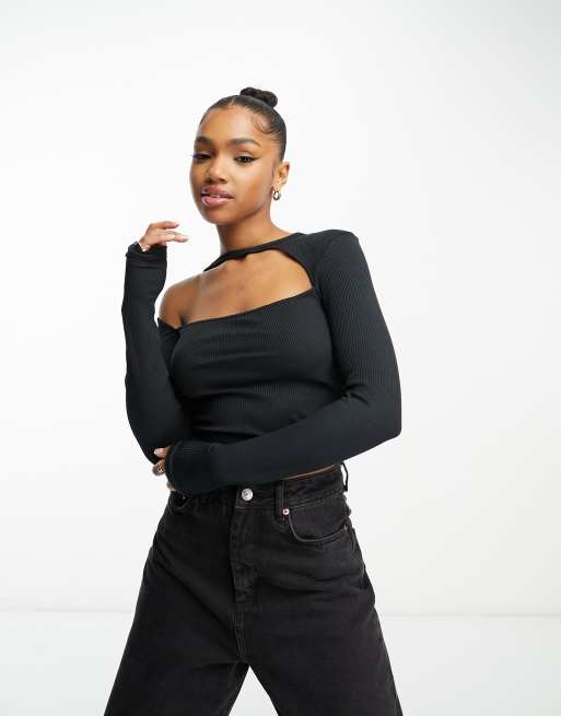 Bershka – Geripptes Oberteil in Schwarz mit Zierausschnitt