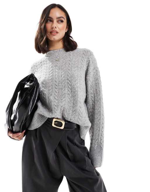 Bershka – Hochgeschlossener Oversize-Strickpullover in Grau mit Zopfmuster