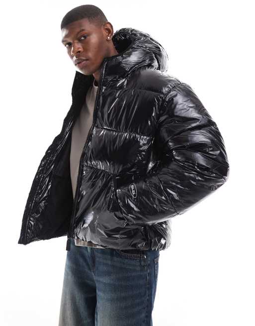Bershka – Hochglänzende Pufferjacke in Schwarz mit Kapuze