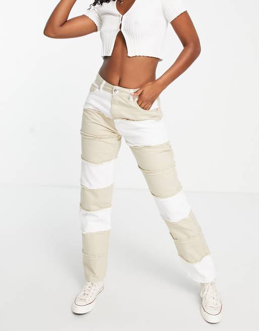 Bershka – Hose im Patchworkdesign in Beige und Weiß