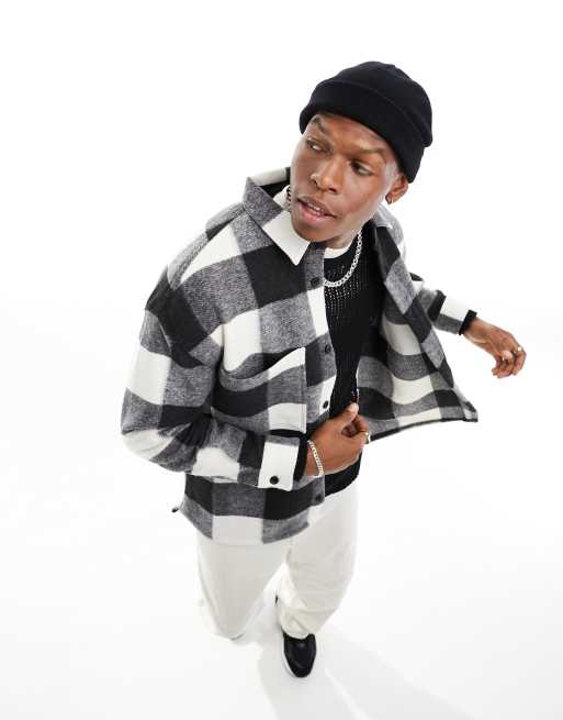Bershka – Karierte Hemdjacke aus Kunstwolle in Schwarz/Weiß