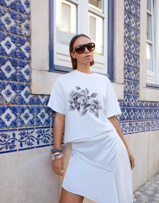 Bershka – Kurzärmliges Oversize-T-Shirt in Weiß mit Print