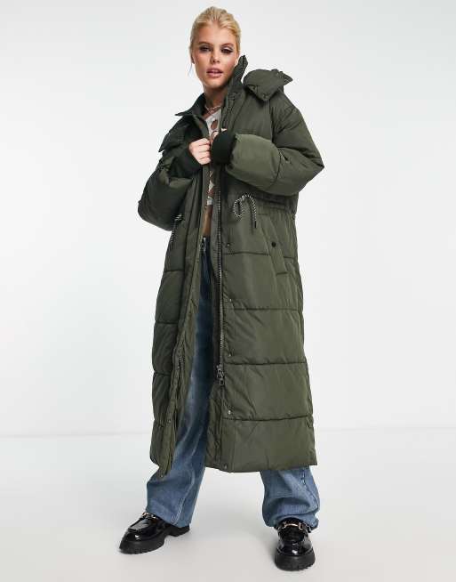 Bershka – Lang geschnittener Steppmantel in Dunkelgrün mit Kapuze