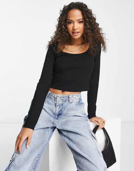 Bershka – Langärmliges Oberteil in Schwarz mit U-Ausschnitt