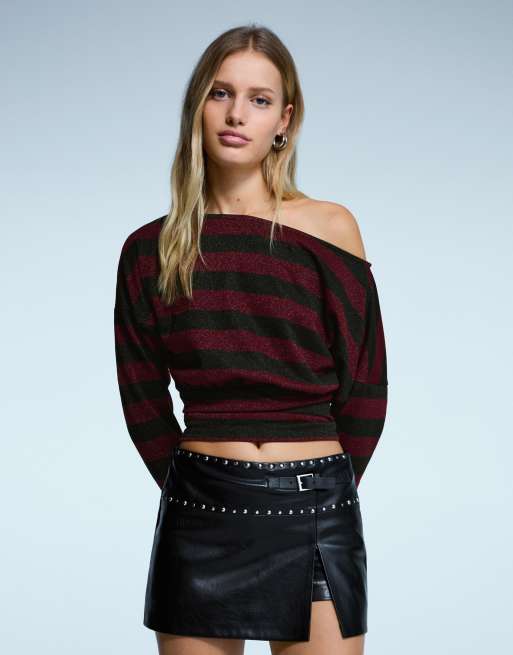 Bershka – Langärmliges, schimmerndes T-Shirt in Burgunderrot mit asymmetrischem Design und Streifen