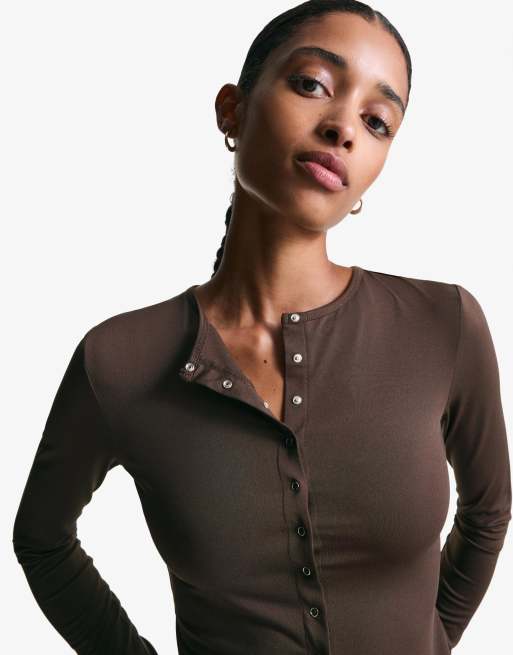 Bershka – Langärmliges T-Shirt in Braun mit Knöpfen