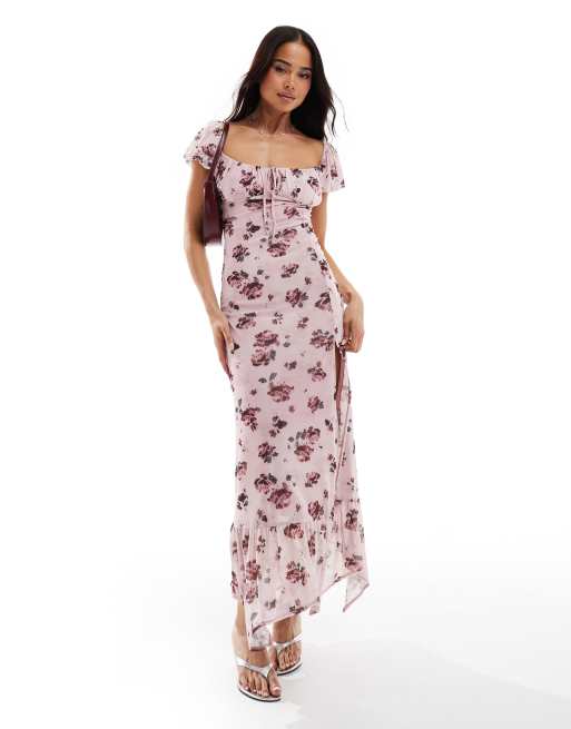 Bershka – Milchmädchen-Maxikleid in Rosa mit Blumenmuster