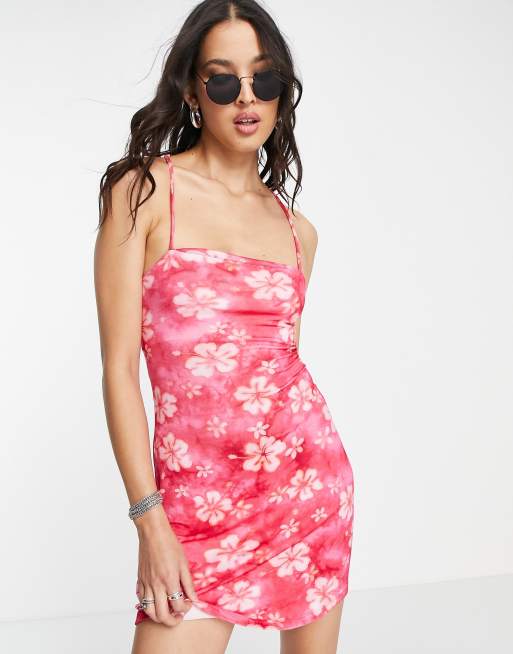 Bershka – Mini-Camisole-Keid in Rosa mit Hibiskus-Blumenprint