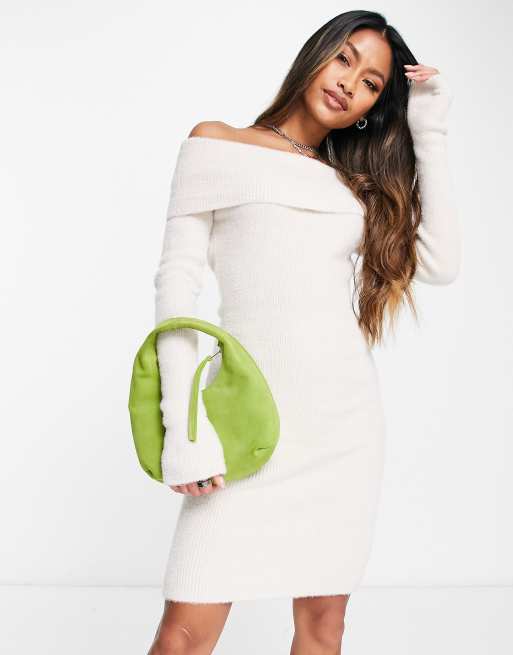 Bershka – Mini-Strickkleid in Weiß mit Carmen-Ausschnitt