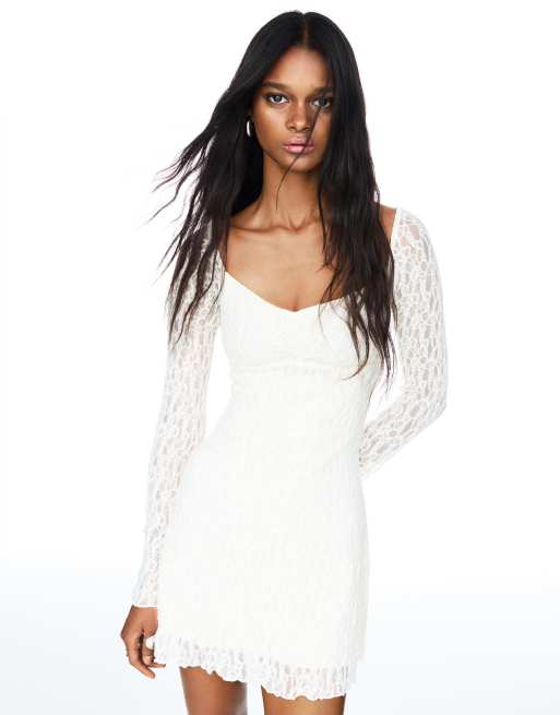 Bershka – Minikleid aus Spitze in Blond-Ecru mit Carmen-Ausschnitt