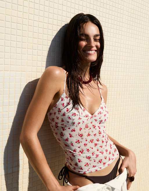 Bershka – Oberteil aus Netzstoff in Weiß mit Riemchenträgern