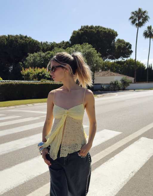 Bershka – Oberteil aus Spitze in Gelb mit schmalen Trägern